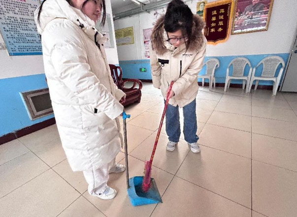 圖為"情暖夕陽銀齡守護"實踐團成員吳龍雨,陳韻靜為老年公寓進行衛(wèi)生清理