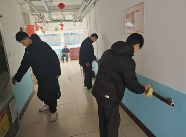 室內清掃工作同樣重要,成員們不放過任何一處臟亂的角落。圖中的成員們正在用抹布擦拭墻面和設施,確保每一處都無塵無污。墻壁和扶手的清潔,體現了團隊對細節的關注與責任心。