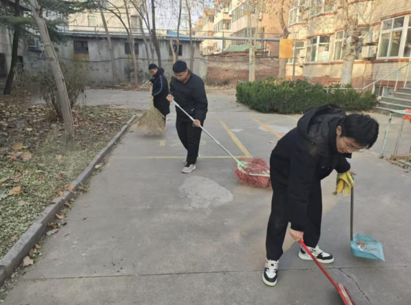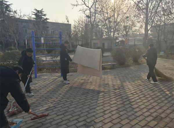 在室外活動區域,成員們不僅清掃落葉,還對公寓內的長椅、健身器材進行了清潔與維護。圖片中展示了團員們齊心協力的場面,有的在拂去地面灰塵,有的舉起床單進行拍打,有的用掃帚認真清掃著走道。通過他們的努力,室外環境煥然一新,也讓老人們在公寓內的活動更加舒適。