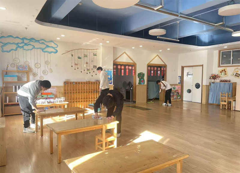 除了為孩子們開展活動外,實踐團還對社區內的幼兒活動室進行了全面清潔。擦拭課桌、整理書架、清掃地面,成員們分工明確,忙碌而有序。