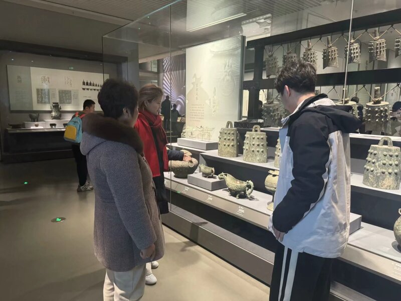 展廳中央的一套青銅編鐘尤其引人注目。編鐘整齊地排列在架子上,散發著莊重而典雅的氣息。據講解員介紹,青銅編鐘不僅是古代的樂器,更是權力和地位的象征。在古代,編鐘常用于祭祀、慶典等重要場合,演奏出的音樂悠揚動聽,象征著和諧與秩序。團隊成員們聆聽著講解員的介紹,仿佛穿越時空,感受到了古代禮樂文化的博大精深。