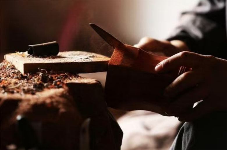 為了讓調研團隊更好的了解二胡的制作工藝,高振保帶領著調研團隊來到了當地的二胡制作工廠。制作過程中每一道工序都需要精雕細琢。除蒙皮環節之外,琴筒的打磨也至關重要,需琴師用砂紙反復摩挲,直至表面光滑如鏡,弧度恰到好處,因為這直接影響二胡的共鳴效果。琴桿的雕刻同樣講究,傳統的龍鳳圖案、花鳥魚蟲在制琴師的刻刀下栩栩如生,既增添了美觀,又傳承了文化寓意。
