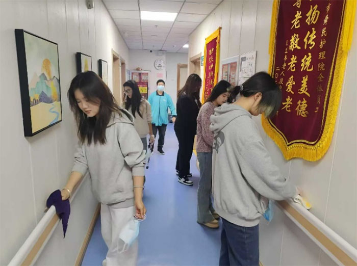 同時,實踐團成員們齊心協力,為老人們打掃了室內外衛生。掃地、擦拭窗臺、整理雜物,每一個細微的動作都是對老年人生活的尊重與呵護。門前的護欄年久失修,志愿者們仔細擦拭和檢查護欄的整潔性和安全性,以確保老人們能夠有一個舒適的環境。