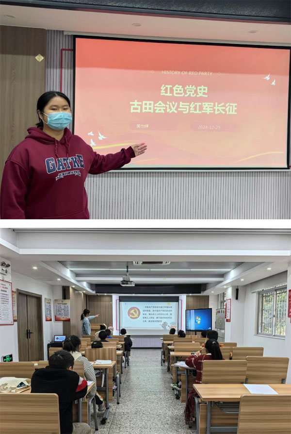 紅色黨史課堂上,老師帶領(lǐng)全班同學(xué)深入了解中國共產(chǎn)黨及龍巖古田會(huì)議。通過講述黨的創(chuàng)立背景、關(guān)鍵事件,結(jié)合珍貴歷史影像資料及部分動(dòng)漫視頻,激發(fā)了學(xué)生們的學(xué)習(xí)興趣。同時(shí),扎根本土紅色文化,重點(diǎn)介紹古田會(huì)議的重要性,講述閩西革命先輩的奉獻(xiàn),加深了學(xué)生們對黨史的理解及民族自豪感,激發(fā)了學(xué)生們的愛國情懷和為實(shí)現(xiàn)民族復(fù)興而奮斗的使命感。