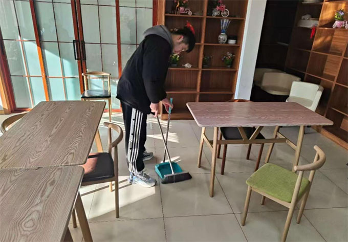 高春凱專注地拖著地,每一個(gè)動(dòng)作都認(rèn)真而有力,將地面拖得潔凈光亮,為老人們創(chuàng)造舒適的行走環(huán)境。陳萬(wàn)慶站在窗邊,認(rèn)真地擦拭著玻璃,隨著他的動(dòng)作,窗戶變得明亮通透,陽(yáng)光毫無(wú)阻礙地灑進(jìn)屋內(nèi)。尤興旺則在一旁為老人輕輕按肩膀,手法嫻熟,幫助老人緩解身體的疲憊,老人愜意地享受著這份貼心關(guān)懷。