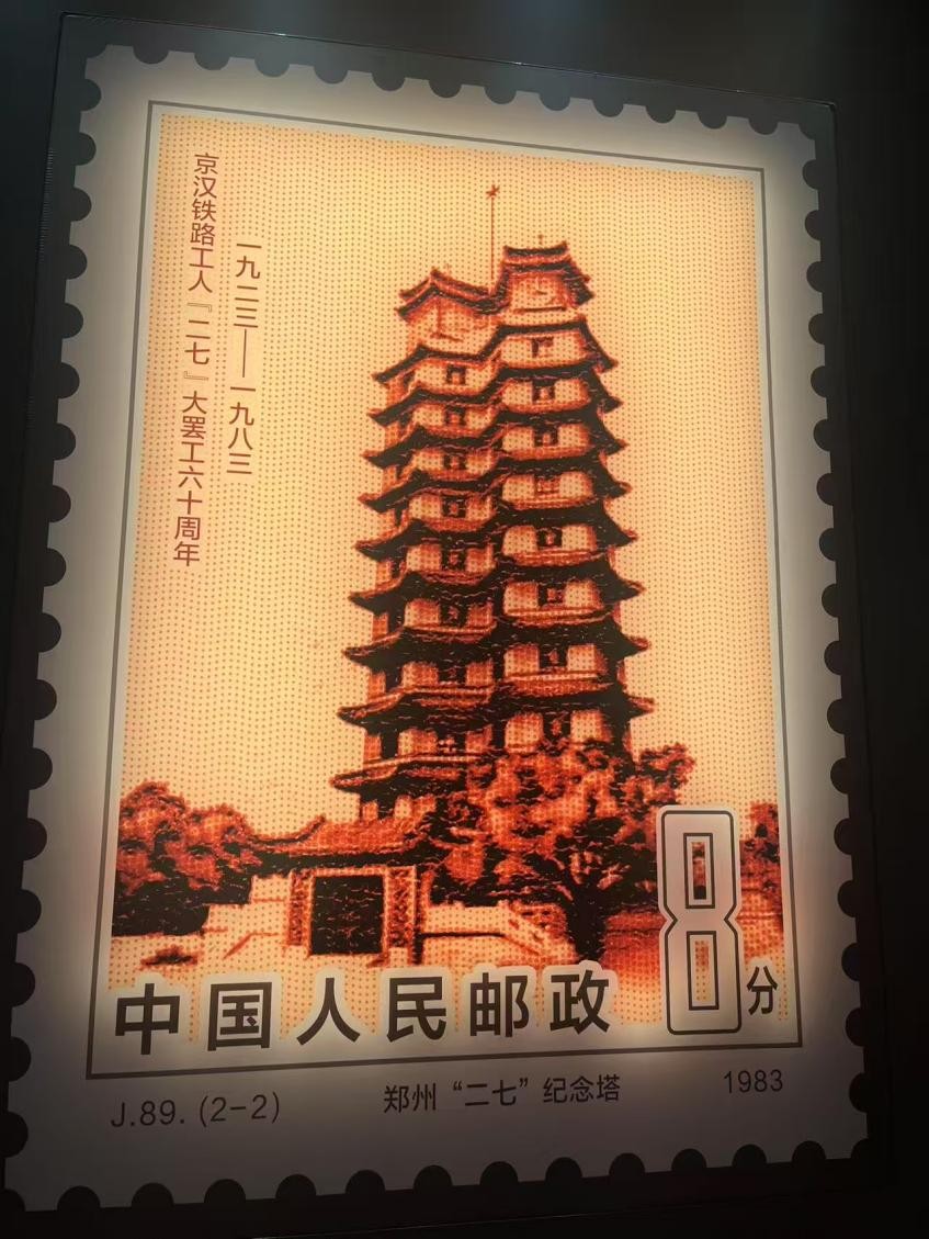 圖為館內展出的中國郵政發行的二七塔紀念郵票。齊心悅 攝