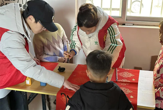 紙間藏歲月,墨香染流年。志愿者精心準(zhǔn)備了對聯(lián)紅紙、筆墨紙硯等基本工具,教給小朋友們?nèi)绾螘鴮憣β?lián)并輔助小朋友們完成自己的作品。志愿者們與小朋友們攜手合作,對聯(lián)宛如跨越時(shí)空傳遞溫暖的使者,為新的一年積攢力量。