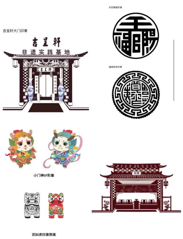 此期間我們團隊采用深度訪談、市場調研與設計實踐相結合的方法,深入了解非遺文化內涵,精準對接市場需求,確保設計既具創新性又兼具文化傳承價值。通過深度挖掘非遺文化內涵,融合現代設計理念,團隊不僅實現了非遺文化的活態傳承,更通過“小門神”IP形象的創新設計、非遺專屬印章與雕刻圖案的深度挖掘,以及非遺講解員大賽中榮獲學生組一等獎,為非遺文化的傳播與保護開辟了新路徑。