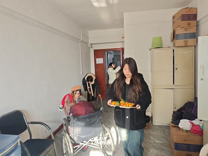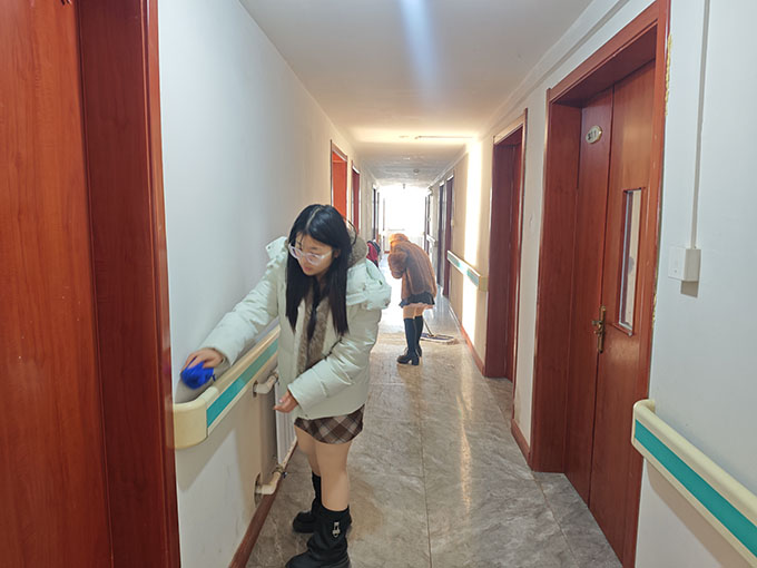 實踐成員對養老院的走廊、樓梯扶手、暖氣等公共區域進行全面打掃與清潔,認真擦拭扶手,拖地時不放過任何一個死角,為老人營造一個安全衛生的公共活動空間,降低疾病傳播風險。在打掃過程中,實踐成員還會抽空陪老人聊天,關心他們的生活狀況。