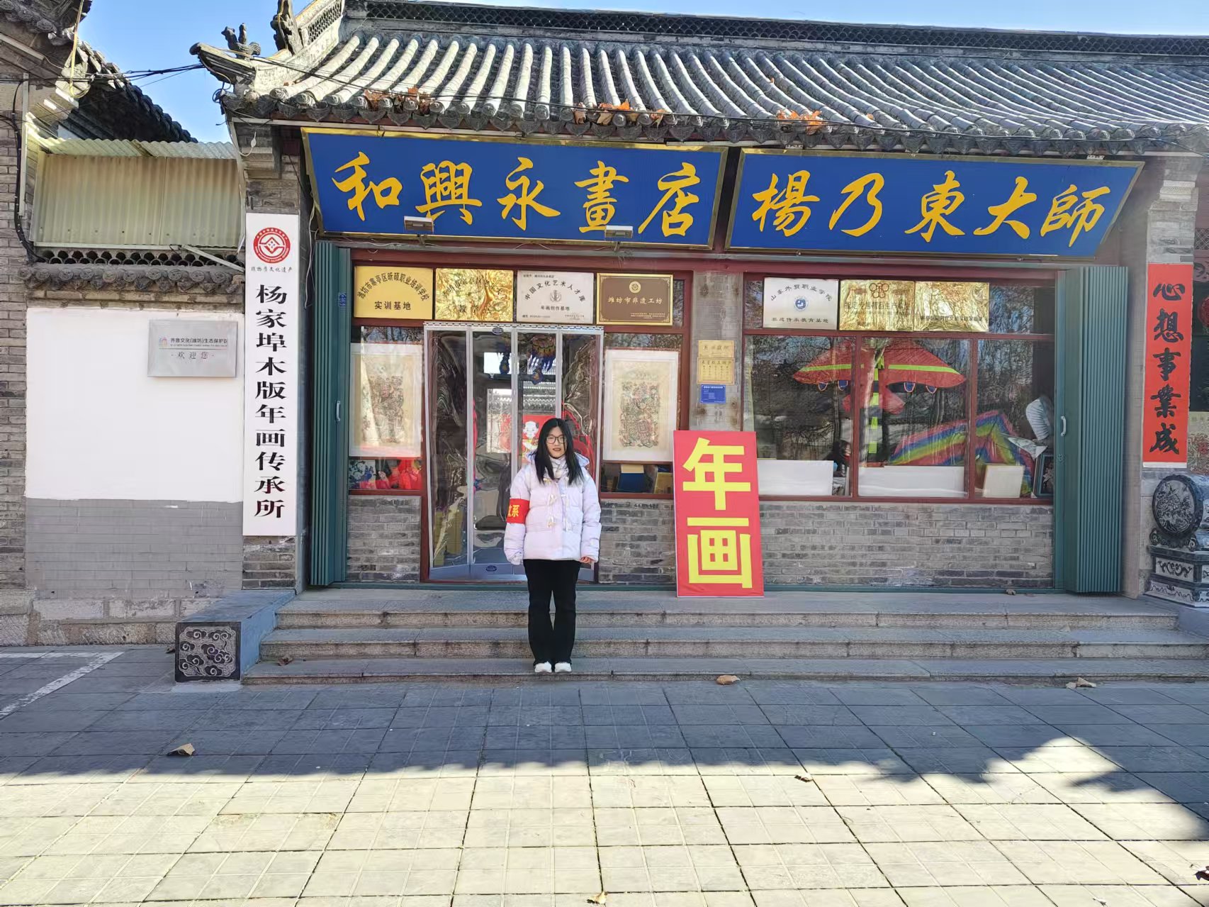 三、實踐單位及崗位介紹實踐單位位于濰坊市寒亭區楊家埠村楊家埠百年老字號“和興永年畫店”,我在一家具有多年歷史的年畫作坊中,跟隨一位經驗豐富的老藝人學習——楊乃東,楊家埠百年老字號“和興永年畫店”第十三代傳人,楊家埠木版年畫省級非物質文化遺產代表性傳承人。主要崗位是了解了木板年畫的制作過程,并參與了部分制作,在學習過程中逐漸獨立操作,深刻體會到了家鄉傳統非遺技能的魅力。