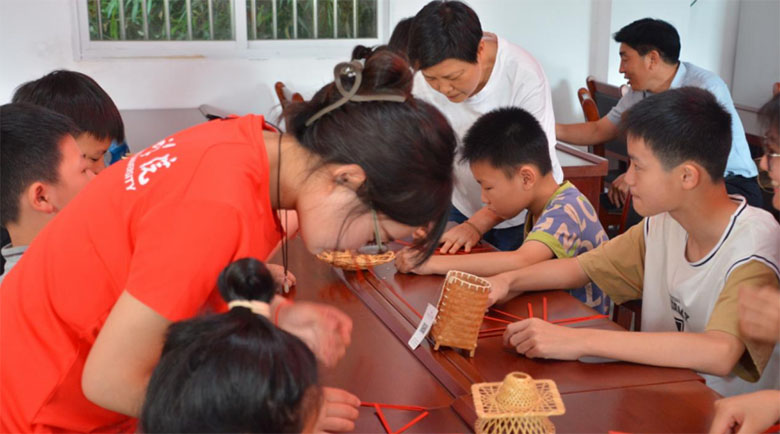 。ㄍㄓ崋T 鄧胡情)皖西學院外國語學院的八名大學生在外國語學院團委副書記朱麗娜、專職輔導員張穎的帶領下組建了“鄉村支教顯擔當,非遺傳承促振興”“翠竹匠心,守護非遺”暑期支教團隊,在六安市獨山鎮游芳沖村康寧竹編廠學習了非遺竹編的傳統文化同時也陪伴當地的孩子們開啟了一段充實而豐富的暑期生活。