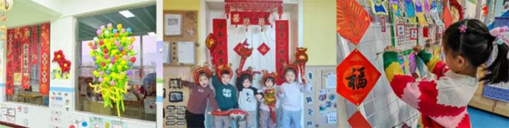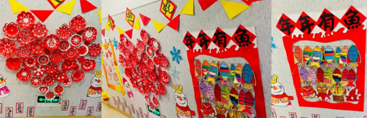 大武口區第一幼兒園的教室經專業設計煥然一新。實踐團隊運用環保再生材料,以蛇年生肖文化為核心元素,創新設計“祥蛇盤福”立體墻飾、傳統紋樣吊飾等環創作品。火紅的燈籠矩陣與鏤空剪紙光影交疊,中國結流蘇與幼兒手作福字相映成趣,構建出具有教育性、互動性的傳統文化體驗空間。果果一班主班教師張老師指出,這種情境化教育環境能有效激發幼兒的文化認同感。