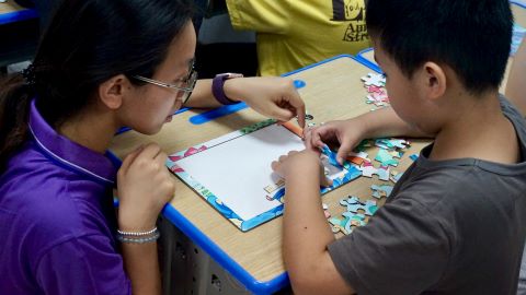 唱國歌活動結束后,是充滿趣味與挑戰的拼圖游戲。實踐團隊希望通過這個游戲,旨在提升孤獨癥孩子們的動手能力和空間認知能力。在拼圖過程中,團隊成員們耐心地陪伴在孩子們身邊,給予他們鼓勵和幫助。