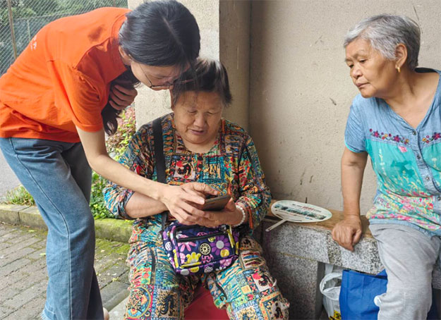 圖二:志愿者在教婆婆如何使用微信聊天