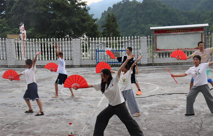 圖為同學(xué)們到室外進(jìn)一步學(xué)習(xí)折扇動(dòng)作