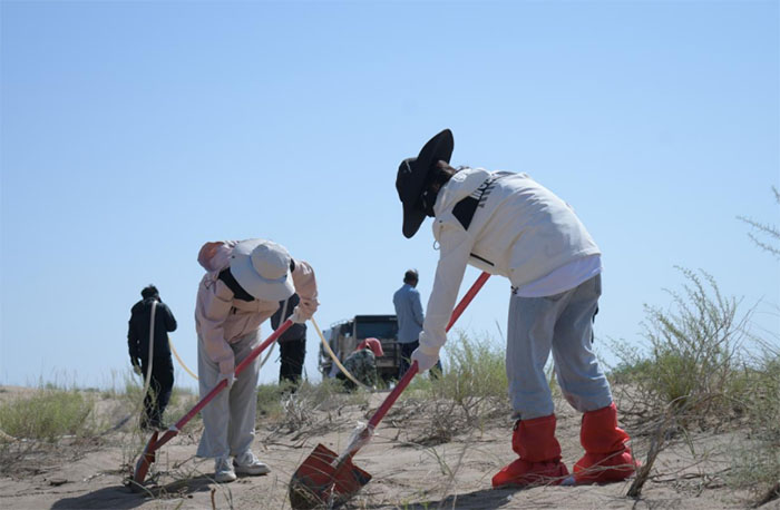 清晨,團隊成員按計劃分成兩支小隊。一支小隊穿梭在基地中,投入基地倉庫清理與環境維護工作:撿拾垃圾、規整物資,為基地運營掃清障礙。忙碌間隙,隊員們還主動幫阿姨們完成基地配菜工作。用實際行動詮釋了"勞動最光榮"的真諦。隨后,大家搭乘基地的汽車,前往遠處的梭梭林進行苗木維護工作。工作期間,隊員們以“輕踩慢移”的姿態行動,確保每一株小號梭梭苗得到精心照料,用動作體現出對這些荒漠綠苗的敬畏。隊員們還與水車司機進行了深入交流。司機叔叔不僅分享了治沙工作的艱辛與成就,還現場演示了護苗技巧。他粗糙的雙手和樸實的語言,傳遞著治沙人的智慧與堅守,讓隊員們深刻體會到生態治理的不易與偉大。與此同時,為了解民勤當地的農村產業發展,了解鄉村振興成果,另一支調研小隊走出基地,深入民勤田野與當地農戶交流,了解農作物的生長情況以及他們的生活現狀。