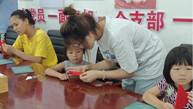 教學(xué)時(shí),志愿者把復(fù)雜紋樣拆解成“折一折、畫小稿、慢慢剪”三步。給孩子們發(fā)的紅紙,特意選了不易撕破的材質(zhì),剪刀也提前磨圓刀尖。折紙環(huán)節(jié),有孩子總對(duì)不齊邊角,志愿者就用彩筆在折痕處輕輕畫點(diǎn)標(biāo)記;剪刻時(shí),有小朋友不敢下剪,志愿者便握著孩子的手,帶著他們剪出第一個(gè)弧線。