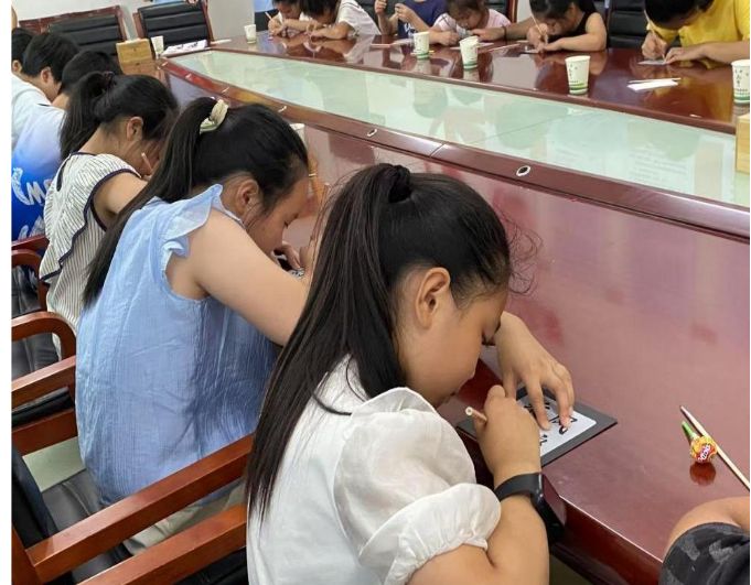 在志愿者的悉心指導下,孩子們拿起鉛筆,在黑色卡紙上細致地描繪出樓板上的圖案。隨后,他們小心翼翼地將金箔貼在畫紙上,輕壓固定,使其與膠水緊密結合。最后,將軟毛刷輕輕掃去表面的多余箔片即可。