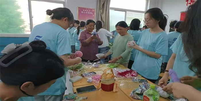 巧手生香:一柄藥錘敲響健康鄉音 與此同時,另一群學生正被艾草清香包圍。在活動室的長桌上,艾草、決明子等中藥堆成小山,彩色粗布與木柄排列整齊。老人們手指翻飛,跟隨實踐隊員縫制養生經絡捶。手中沉甸甸的經絡捶,不僅是中醫藥文化與傳統技術的交融,更是將青春的熱度錘進古老血脈,讓關懷化作可觸碰的溫暖,一次次發出鄉村振興的時代強音。