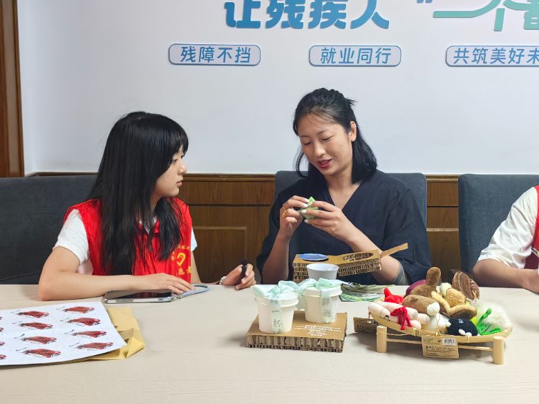 二、市場賦能:善達(dá)未來的破冰探索 “殘疾人之家是第一道港灣,真正走向社會(huì)還需專業(yè)力量。”善達(dá)未來助殘服務(wù)中心正搭建就業(yè)轉(zhuǎn)化橋梁。面對肢體障礙、聽障、心智障礙等多元群體,善達(dá)未來摸索出適配路徑:為聽障設(shè)計(jì)師組建專屬項(xiàng)目組,由“橋梁”主管協(xié)調(diào)溝通;為外向心智障礙者開拓市集崗位,采用“聽障+心智障礙”融合搭檔模式。其開發(fā)的“聊贈(zèng)一杯春”文創(chuàng)茶品,包裝附二維碼展示殘障伙伴工作場景,環(huán)保小包裝設(shè)計(jì)在市集廣受歡迎,讓殘障伙伴的努力被社會(huì)看見。負(fù)責(zé)人陳咪老師直言: