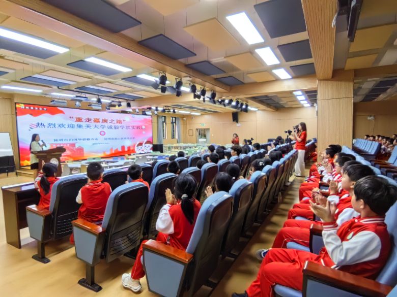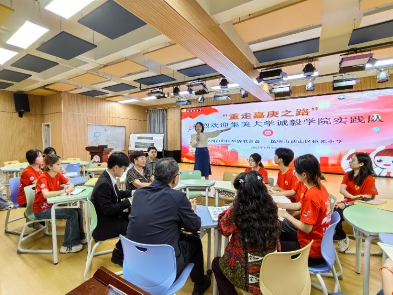 為深入貫徹學習習近平新時代中國特色社會主義思想,在新時代弘揚嘉庚精神,講好嘉庚故事,6月30日下午,集美大學誠毅學院“毅馬當先”實踐隊前往云南省昆明市僑光小學開展主題宣講及座談交流活動。活動由昆明市僑聯、僑光小學聯合舉辦。昆明市僑聯黨組成員、副主席李伊,市僑聯文化宣傳部部長陳敏,僑光小學黨支部書記段紅燕,集美大學誠毅學院團委書記劉琳燕,南僑機工后裔及親屬代表張田玉、陳麗蘭,僑光小學師生代表與實踐隊全體成員等到場參加。