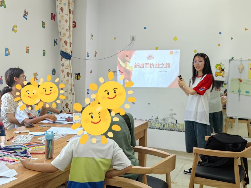 活動中,實踐團(tuán)成員生動講述還原歷史,從新四軍組建講起,到上海根據(jù)地斗爭,再到辦事處同志奔走籌物資、聯(lián)絡(luò)點培育革命力量,把艱辛與熱血一一呈現(xiàn)。講完歷程,又以史料照片、故事片段加深觸動,讓孩子們在聽故事、悟精神的互動里,燃起對革命先輩的崇敬,讓新四軍抗戰(zhàn)精神在新一代心中牢牢扎根。