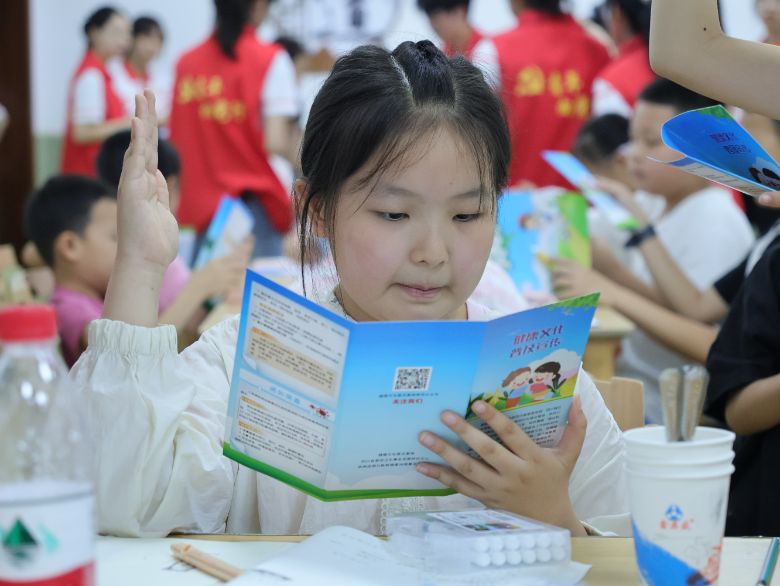 ▲圖為小朋友正在認真閱讀科普宣傳手冊