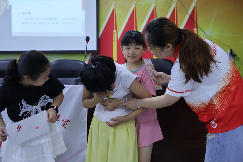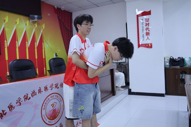 實操教學完成后,實踐隊隊員們“手把手”引導孩子們運用的海姆立克法模擬施救,糾正按壓位置、明確發力角度。孩子們從懵懂模仿到主動踐行,用科普知識的落地生根去筑牢日常生活的健康認知防線。