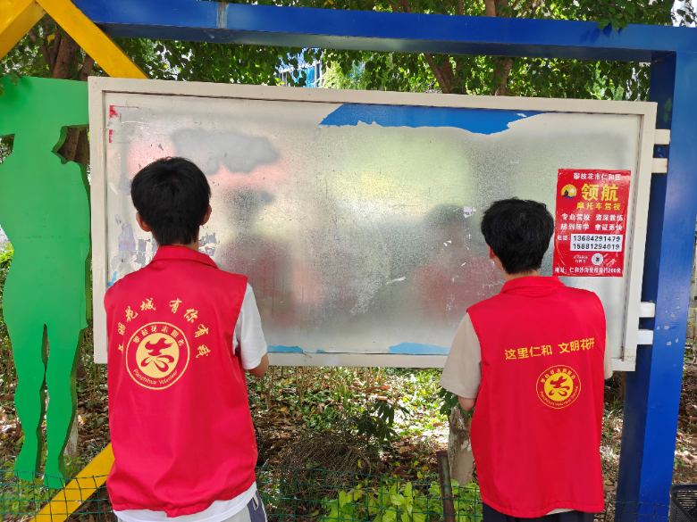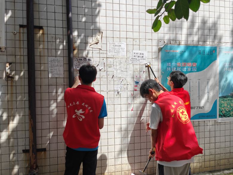 環境整治煥新顏:針對社區內墻面、樓道存在的雜亂小廣告問題,隊員們組建“清潔小分隊”,帶著鏟刀、抹布、涂料等工具,對轄區內30余棟居民樓進行全面清理。他們逐單元排查,共清除各類小廣告200余處,對破損墻面進行修補粉刷,還聯合社區制作10塊“便民信息公示欄”,引導商戶規范張貼信息。“以前樓道里貼滿小廣告,看著就心煩,現在干干凈凈的,住著都舒服!”居民李阿姨的感慨道出了環境改善帶來的獲得感。