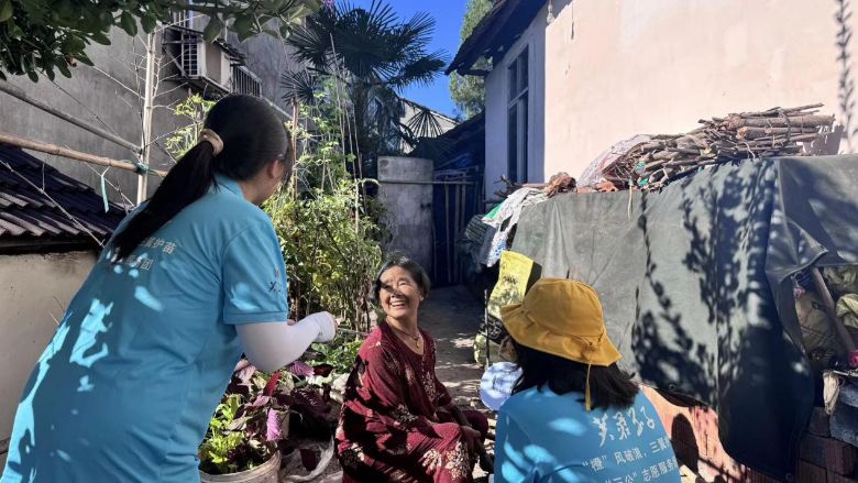 志愿者與黃雙沖村老奶奶交談(嚴子瑜 攝)