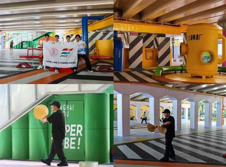 實踐隊隊員通過前期調研和實地考查,了解了曹楊路橋萬航渡路路段的橋下空間的歷史文化和改造思路。設計師以工業管道為核心元素,大膽采用“多巴胺”配色與孟菲斯風格設計,明快跳躍的色彩與幾何圖案相互碰撞,為原本灰暗的橋下空間注入活力,形成極具視覺沖擊力的藝術效果。同時,其還深度融入蘇州河工業歷史元素,啤酒桶造型的互動裝置、造幣廠風格的磨砂樹脂座凳、面粉廠儲料管造型的藝術裝置,讓市民在休閑娛樂中,沉浸式感受蘇州河的工業文化脈絡。