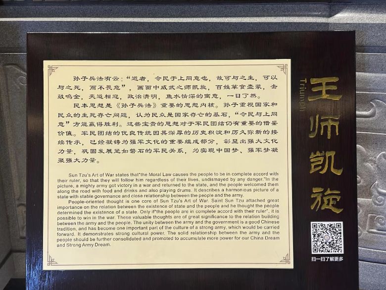 在兵圣宮內,實踐隊隊員依次參觀了孫子文化展示區、戰陣演練區、戰役回眸區和古代將帥區。在孫子文化展示區,通過大量的文物、圖片和多媒體展示,實踐隊隊員深入了解了孫武的生平事跡和《孫子兵法》的誕生背景。從孫武的成長經歷,到他在吳國的軍事生涯,再到《孫子兵法》的創作與傳承,每一個故事都讓實踐隊隊員對這位偉大的軍事家有了更深刻的認識。