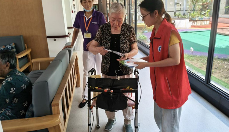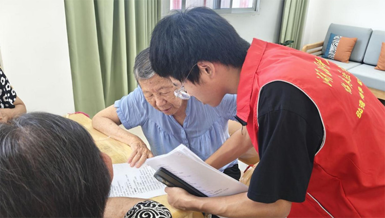除了健康科普宣傳環節,團隊還采用“問卷+訪談”的立體調研法,深入了解老年群體健康需求痛點與康養服務現狀,為優化社區健康服務提供數據支撐。此次調研范圍不僅涵蓋老年群體,還特意加入了護工人員與康養中心工作人員。針對視力不佳的老人,隊員們逐題讀出選項;遇到聽力障礙的,則用事先準備的圖文卡片輔助溝通。面對護工群體,隊員們設計了專門的問卷,內容涉及日常照護中遇到的健康知識盲區、希望獲得的專業培訓等。2小時里,整理出“希望增加中醫理療”“需要定期上門體檢”等條核心需求。同步發放的《中國老年人健康指南》,實現了健康知識從“普及”到“精準配送”的升級。