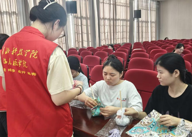在開展調(diào)研的同時,團(tuán)隊還融入了健康科普與互動體驗環(huán)節(jié)。“艾草錘制作”互動體驗更是將活動氛圍推向高潮。志愿者們結(jié)合中醫(yī)典籍,生動講解艾草安神助眠的藥理特性,指導(dǎo)參與者將傳統(tǒng)養(yǎng)生智慧縫制成實(shí)用的解壓工具。穿針引線間,傳統(tǒng)中醫(yī)藥文化與現(xiàn)代健康管理理念悄然交融,不僅為緊張的調(diào)研工作注入輕松氛圍,更搭建起醫(yī)患互動的溫情橋梁。