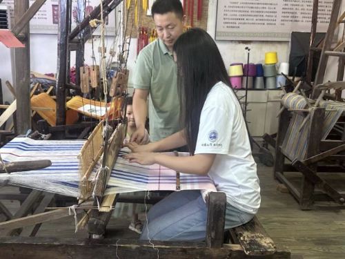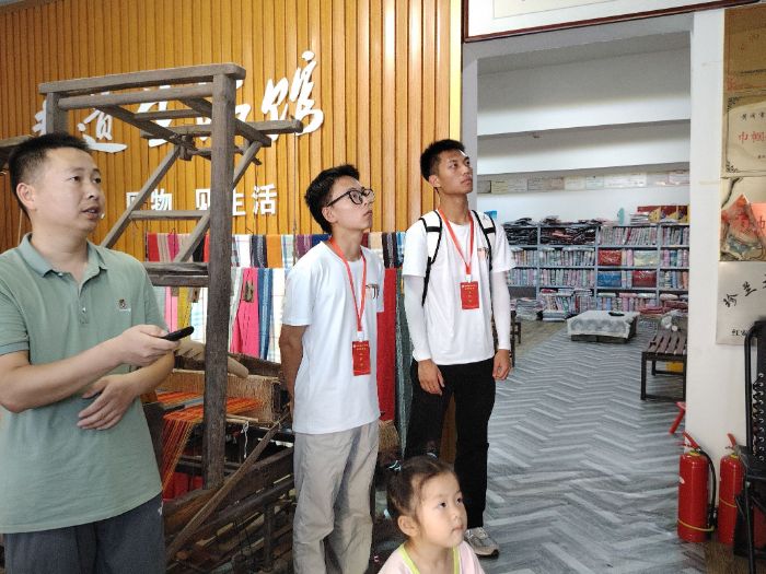 在陶師傅和陶母許可下,兩位老師傅耐心細致地示范、講解,手把手地指導實踐隊員如何使用織機。就在我們專注聆聽陶師傅講解技巧時,一個小身影吸引了大家的目光——陶師傅的小女兒,正安靜地在一旁抬頭看著父親指導哥哥姐姐們的動作,眼神里充滿了專注與好奇。