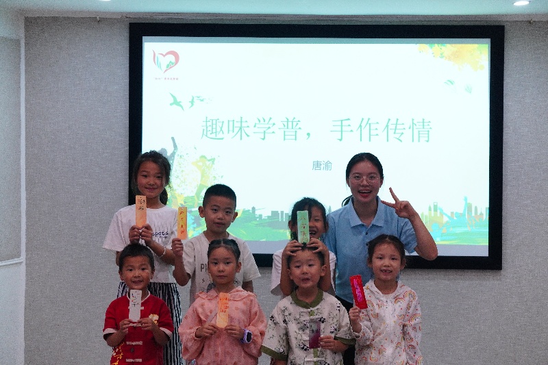 “紅心”青年筑夢(mèng)團(tuán)實(shí)踐團(tuán)隊(duì)針對(duì)鄉(xiāng)村兒童這一重點(diǎn)群體,精心策劃并開(kāi)設(shè)“推普小課堂”。課堂以“趣味學(xué)普,手作傳情”為理念,將地域文化元素與普通話教學(xué)深度融合。“方言蹲蹲蹲” 游戲里,孩子們圍繞聲母“b”“p”“d”“t”接力下蹲,在肢體律動(dòng)中夯實(shí)拼音基礎(chǔ);“口令繞繞繞”環(huán)節(jié),從“四是四,十是十”的初級(jí)訓(xùn)練,到“南南種蘭花,蘭蘭種南瓜”的進(jìn)階挑戰(zhàn),孩子們?cè)诖烬X交鋒中打磨發(fā)音精準(zhǔn)度。