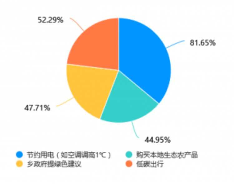 在所有受訪者中,81.65%的人選擇了節約用電(如空調調高1℃),顯示出人們對節約能源的高度認可和接受度。這表明,節約用電不僅是個人行為,也是社會普遍關注的環保措施。