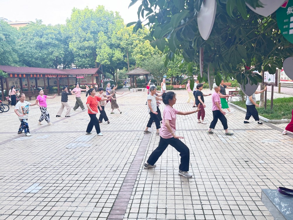 活動現(xiàn)場氣氛熱烈。實踐團隊提前在社區(qū)舞蹈室進行教學(xué)演練,精心準(zhǔn)備教學(xué)內(nèi)容、打磨教學(xué)細(xì)節(jié)。隨著夕陽西下,社區(qū)的老人們陸續(xù)來到廣場,滿懷期待地等待課程開始。團隊教學(xué)組組長楊安琪耐心細(xì)致地講解太極拳的基本動作要領(lǐng),從起勢到云手,一招一式都分解示范。老人們精神飽滿,認(rèn)真跟隨學(xué)習(xí),團隊成員則在一旁一對一指導(dǎo),確保每位參與者都能掌握動作技巧。活動現(xiàn)場氣氛融洽,晚風(fēng)吹拂,音樂舒緩,大家沉浸在太極的柔美與力量之中。