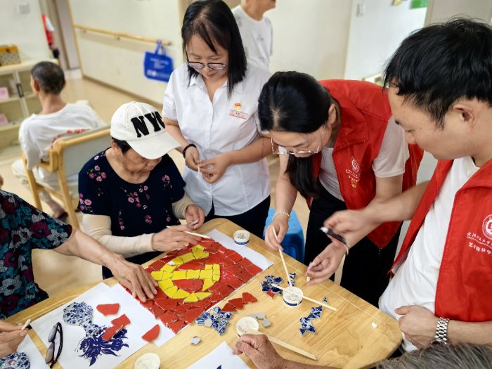 實操環節中老人們的創作熱情格外高漲,大家圍繞生活意象展開巧思——素雅的青花瓷片拼出瓶頸纖長的花瓶,寓意平安順遂;五彩碎瓷組合成振翅欲飛的蝴蝶,象征生命活力。最令人動容的是,兩位經歷過歲月洗禮的老人提議與志愿者共同創作一幅黨旗圖案,紅色瓷片勾勒出旗幟的莊嚴輪廓,黃色瓷片精準拼出鐮刀錘頭的鮮明符號。65歲的馬奶奶表示:“這面‘瓷片黨旗’,是我們老黨員與年輕人共同的心意,看著就暖心!”志愿者們一邊協助調整瓷片角度,一邊聽老人們講述崢嶸歲月,兩代人在創作中完成了一次跨越時空的精神對話。的靈動,在指尖流轉間成為非遺傳承的鮮活注腳。