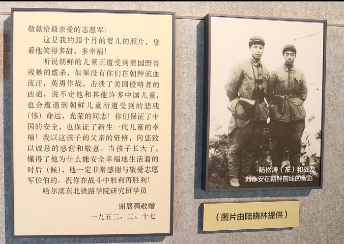 移步至志愿軍相關展區,另一封家書同樣震撼。1952年,志愿軍收到一封祖國的來信與一張嬰兒的照片。信中寫道“這是我的四個月的嬰兒的照片……你們保證了中國的安全,也保證了新生一代兒童的幸福”,字字句句都是后方百姓對志愿軍的感恩。前線浴血與后方牽掛,通過家書緊緊相連,彰顯志愿軍保家衛國的意義。