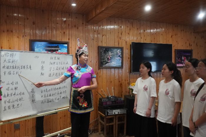 在現場,藍老師展示了畬族民歌的唱腔,并向隊員們教授了兩首基礎的民歌。她強調,畬族民歌歌詞的第一、第二、第四句的尾字必須押同音韻,還需要加入襯詞“哩啰”。