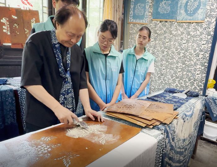 匠心對話:非遺傳承人的堅守與開拓 “藍印花布制作有十余道工序,從選布、脫脂、裱糊到刻板、染色、晾曬,每一步都需精準把控”。國家級非遺傳承人吳元新大師一邊演示刮漿技藝,一邊向成員們耐心講解。年過六旬的他,是南通藍印花布的“活字典”。四十年來,吳元新大師致力于傳承和保護藍印花布非遺技藝,1996年創辦全國第一家藍印花布博物館,帶領團隊走進江蘇、浙江、湖南、山東、北京等全國21個藍印花布主要產區,搶救保護明清以來藍印花布實物遺存六萬余件,整理經典紋樣二十余萬個,研究出版專著十余部,多件精品被國家博物館、中國工藝美術館等機構館藏陳列,吳元新大師不遺余力的守護與傳承讓藍印花布技藝在新時代中不斷綻放異彩。
