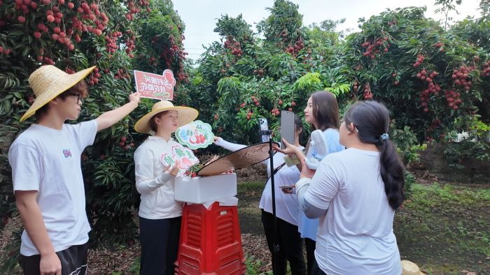 在當(dāng)?shù)卮鍟浀膸ьI(lǐng)下,廣東財(cái)經(jīng)大學(xué)“荔香蜜韻”實(shí)踐團(tuán)走訪多家當(dāng)?shù)剞r(nóng)戶,了解到部分農(nóng)戶電商販“荔”的層次需求。同時,實(shí)踐團(tuán)來自廣東財(cái)經(jīng)大學(xué)的指導(dǎo)老師史專紅、黃蝶君,以及來自華南農(nóng)業(yè)大學(xué)的指導(dǎo)老師李樺親臨桃蓮村,在當(dāng)?shù)?ldquo;禧和驛站”民宿與實(shí)踐團(tuán)全員,當(dāng)?shù)卮鍟洠袼拗骼砣斯采绦聲r代荔枝經(jīng)濟(jì)發(fā)展趨勢,敲定在助農(nóng)大環(huán)境下搭建多方合作橋梁,以“場地+農(nóng)戶+直播”的模式構(gòu)建新型荔枝經(jīng)濟(jì)。