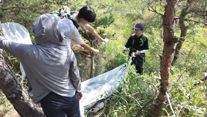 社會實踐團(tuán)成員準(zhǔn)備了所需要的物品以及防護(hù)產(chǎn)品并進(jìn)行了捕蟲培訓(xùn),利用掃網(wǎng)法進(jìn)行對昆蟲的捕捉,通過布置馬氏網(wǎng)來捕捉植被層的昆蟲,在進(jìn)行培訓(xùn)后實踐團(tuán)成員在大澤山進(jìn)行對昆蟲的捕捉,對采集到的昆蟲的生活環(huán)境進(jìn)行記錄保存,保證采集信息的真實性和完整性。實踐過程中,成員們積極抓捕,互相配合,保證實踐的順利進(jìn)行。在采集過程中各組成員小心翼翼力求把對環(huán)境、昆蟲造成的傷害降到最低。