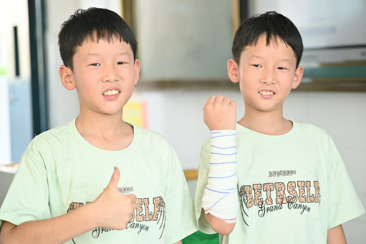 圖為小朋友們正在展示他們螺旋反折包扎的成果 農(nóng)姚 陳立志 攝