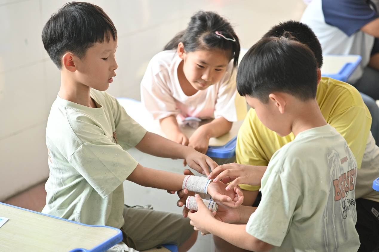 圖為小朋友們正在分組練習(xí)螺旋包扎法 農(nóng)姚 陳立志 攝