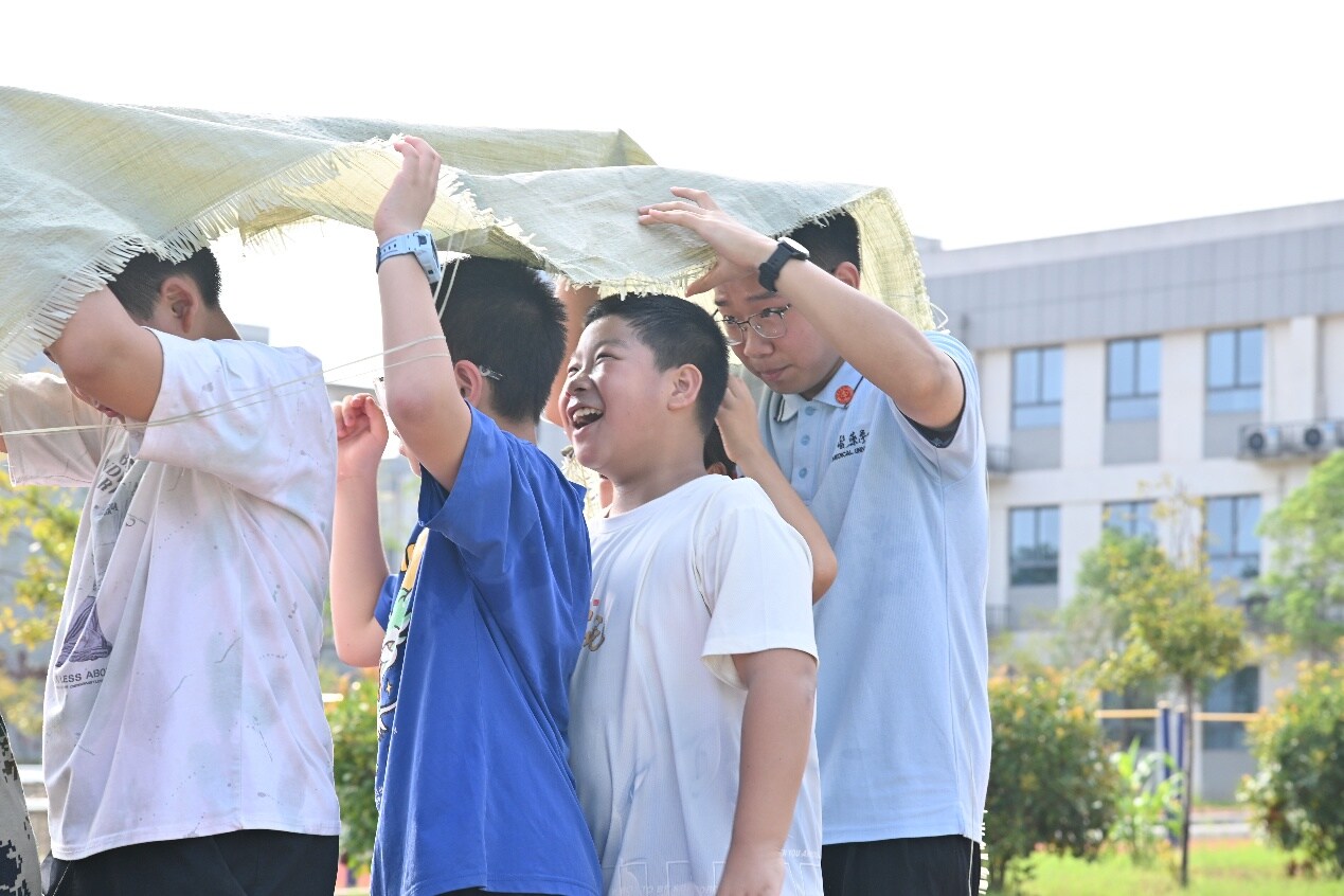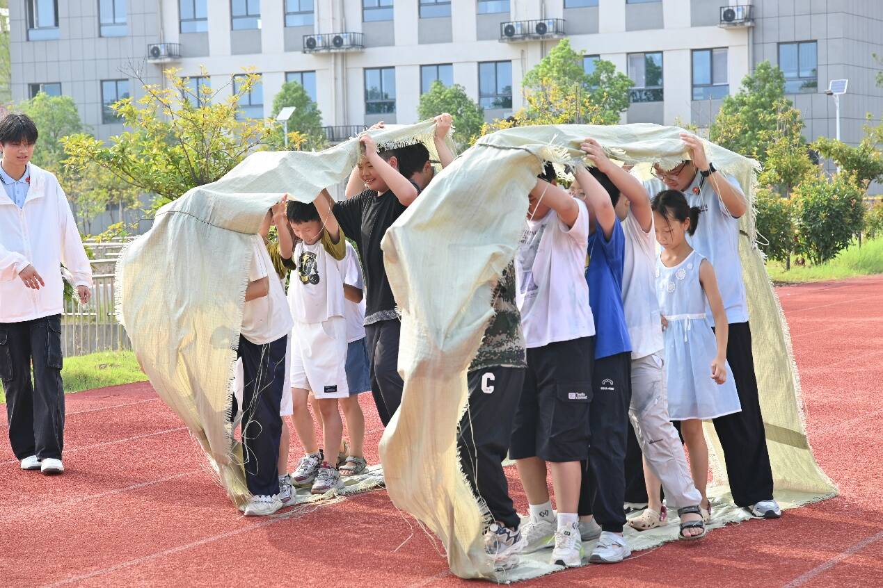 “無敵風(fēng)火輪”挑戰(zhàn)中,師生們擠進(jìn)麻布大袋,起步時腳步凌亂,布袋搖晃。老師一聲“喊口號!”劃破混亂。“一、二!一、二!”整齊的號子如鼓點敲在心上。奇妙變化發(fā)生——大家默契傳遞布袋重量,腳步同頻挪移。笨重的“風(fēng)火輪”仿佛注入魔力,平穩(wěn)滾動。汗水浸透衣衫,卻擋不住一張張燦爛的笑臉。