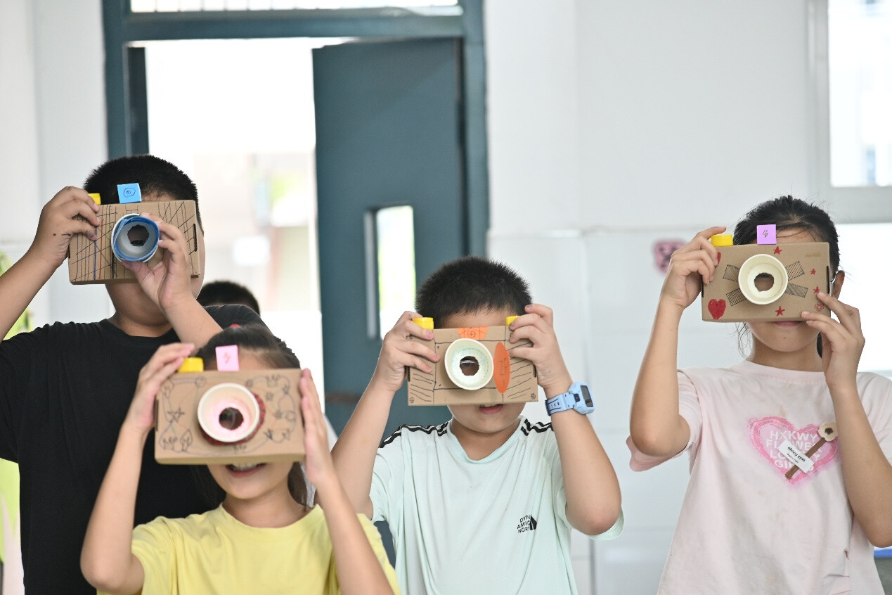 圖為小朋友們和他們卡紙相機(jī)的合影
