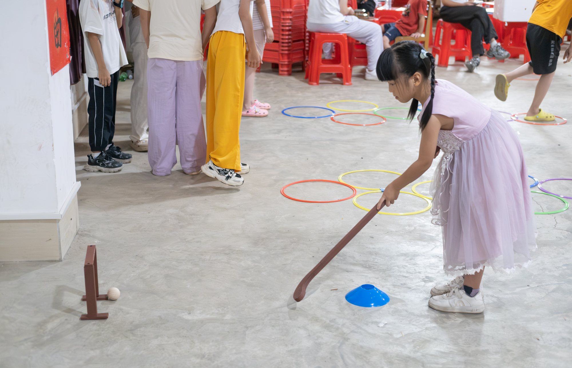 熱身運動結束后就是分組競賽。第一個游戲是“速沖捶丸”。學生們穿過5個標志碟后,迅速拿起球棍擊球,無論是否進球,都立刻折返奔跑。直到每組每位同學都成功投進一次,計時才停止。賽道上,學生們奔跑的身影如風般掠過,擊球時的專注與進球后的歡呼交織在一起。第二個游戲是“沙包投擲”。同學們跳格子至投擲線后,三次投擲沙包嘗試進圈,中一次即可完成任務。跳躍的腳步輕快敏捷,投擲的瞬間屏氣凝神,每一次沙包入圈都引來陣陣喝彩。