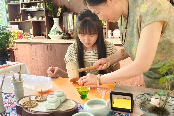 實踐團成員陳孜妍學習老師的制香示范 王瀅攝